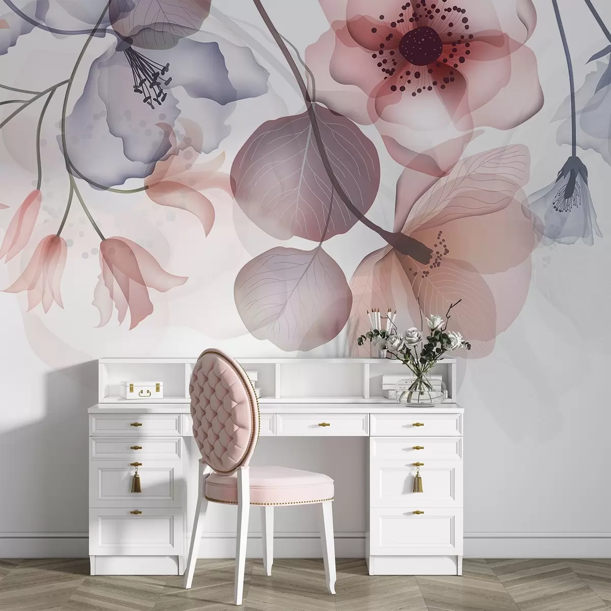 Fototapeter Delikate rosa og grå gjennomskinnelige blomster med myke kronblader og mørk midte, mot en lys bakgrunn Nr. w08613
