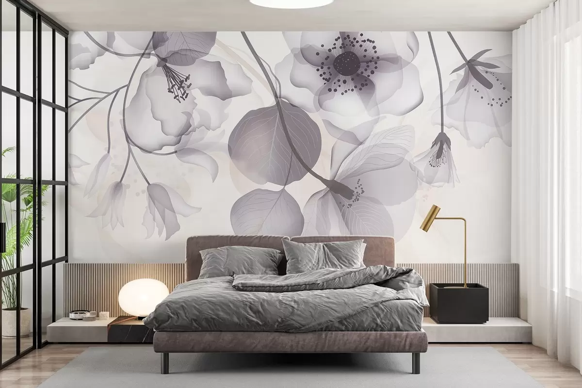 Fototapeter Delikate grå og beige gjennomskinnelige blomster med myke kronblader og mørk midte, mot en lys bakgrunn Nr. w08613v2