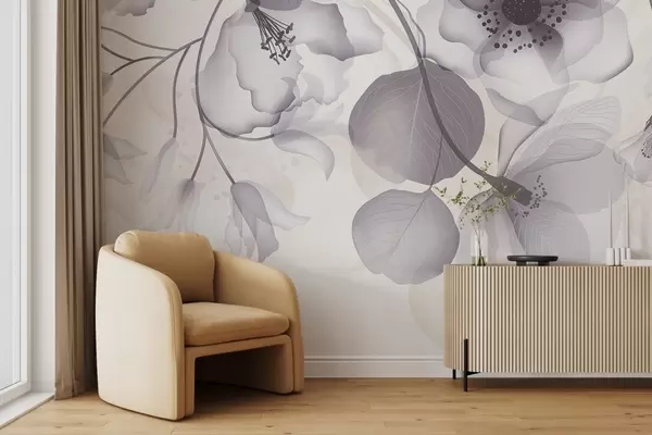 Fototapeter Delikate grå og beige gjennomskinnelige blomster med myke kronblader og mørk midte, mot en lys bakgrunn Nr. w08613v2