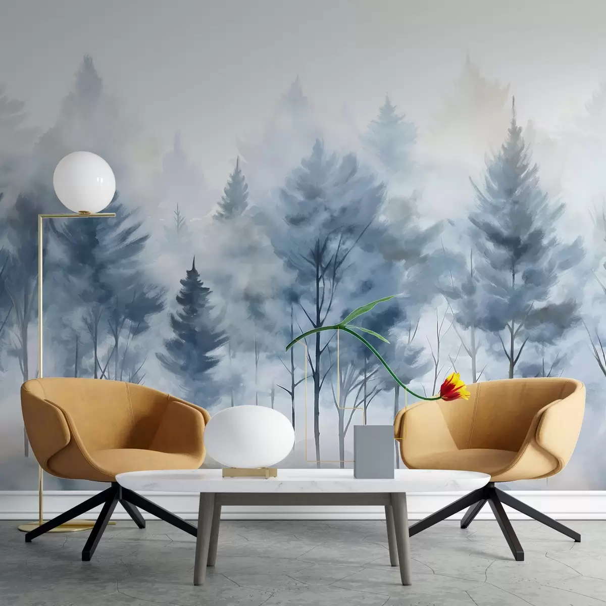Fototapeter Et tåkete skoglandskap med høye furutrær og nakne løvtrær i forgrunnen akvarell-imitasjonskunst Nr. w08643