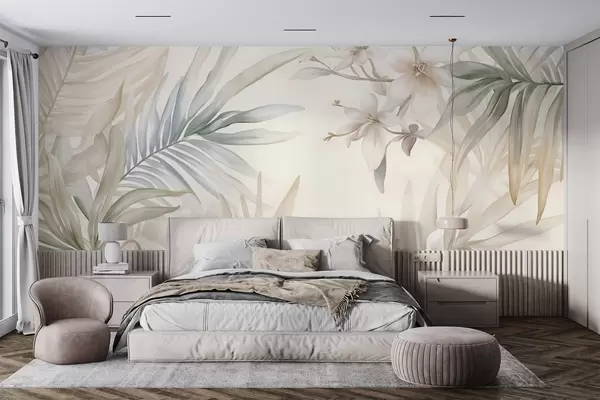 Fototapeter Pastellfargede tropiske blader og blomster, med lysegrønne, kremfargede og sart rosa nyanser Nr. w08660