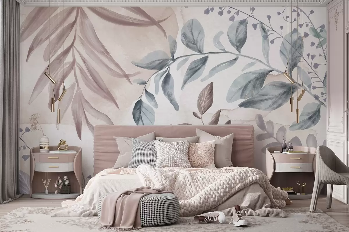 Fototapeter Botanisk trykk med blader og blomstergrener i duse pastellfarger, på akvarellaktig bakgrunn Nr. w08668