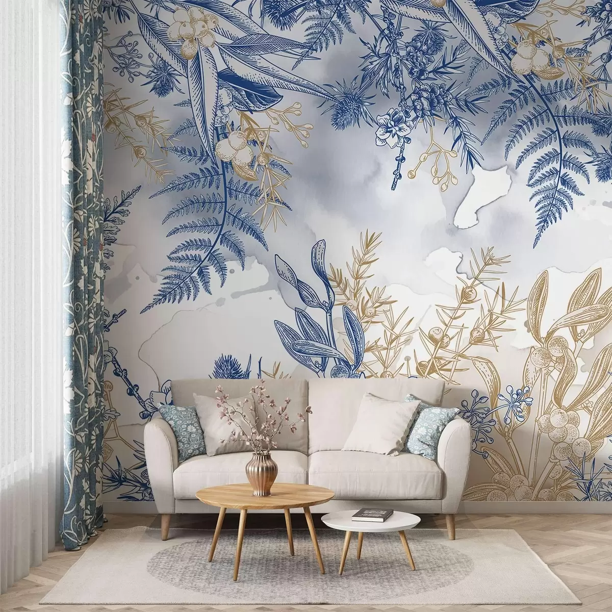 Fototapeter Et blomstertrykk med blå og gule botaniske elementer, mot en lys, myk bakgrunn med akvarelleffekter Nr. w08671