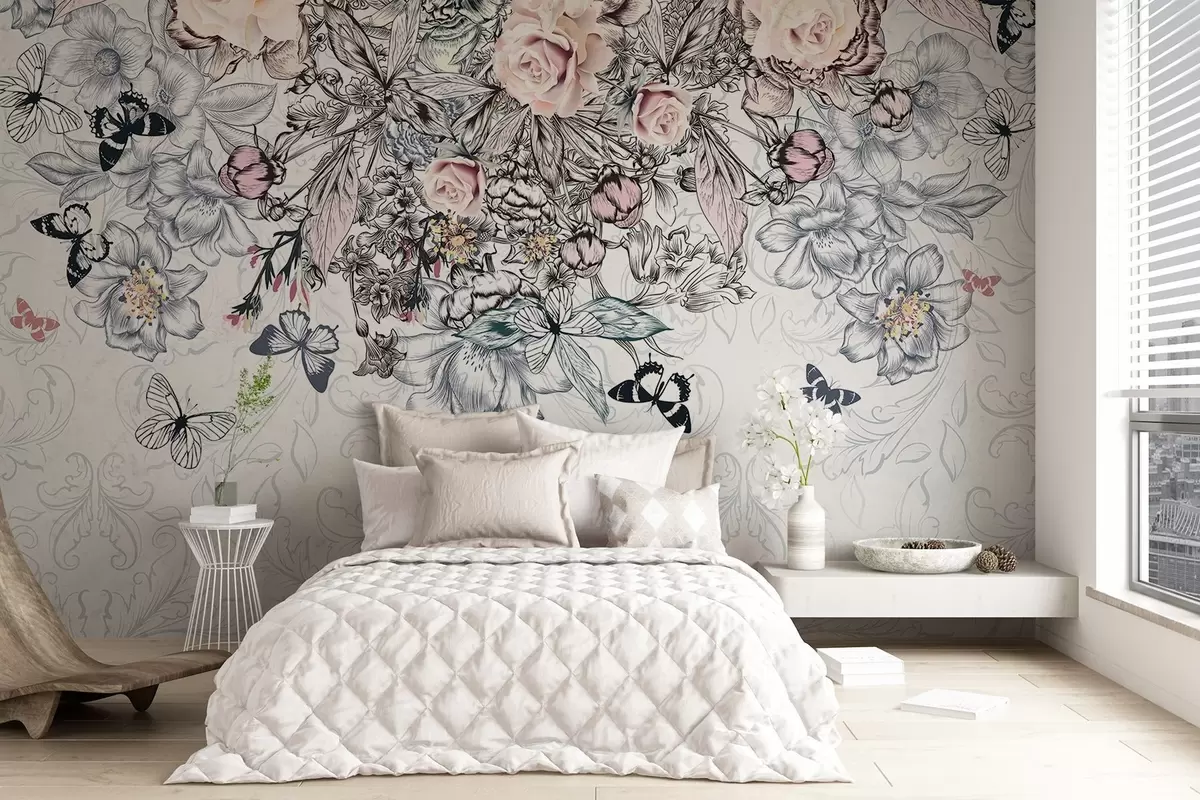 Fototapeter En blomstertegning med rosa roser og forskjellige blomster og sommerfugler med intrikat strektegning på strukturert bakgrunn Nr. w08674