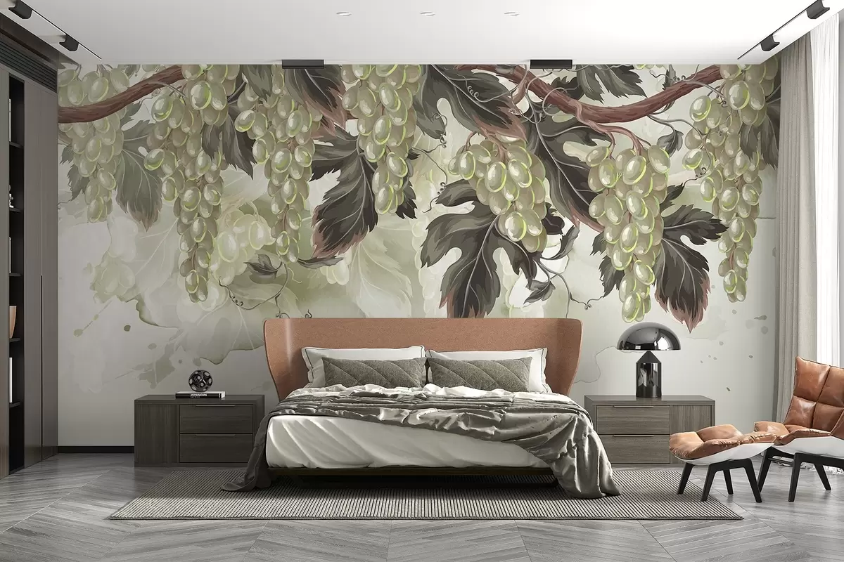 Fototapeter Druer som henger fra en vinranke med grønne blader, mot en lys bakgrunn med akvarellignende teksturer Nr. w08696