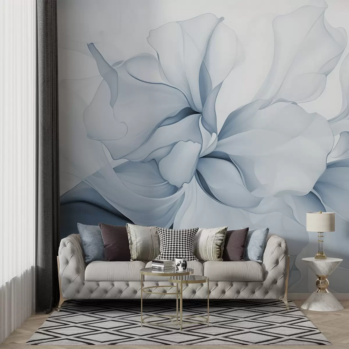 Fototapeter Flytende abstrakte blomsterblader i pastellfarger, gjennomskinnelige og lagdelte former i blå nyanser Nr. w08701v2