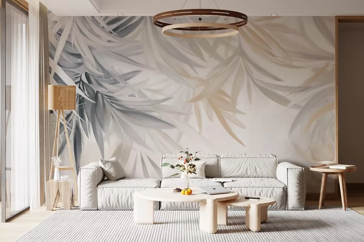 Fototapeter Myke, flytende, lyse tropiske blader i grå og ferskenfargede nyanser, som glir over i et blekt, nøytralt trykk Nr. w08703