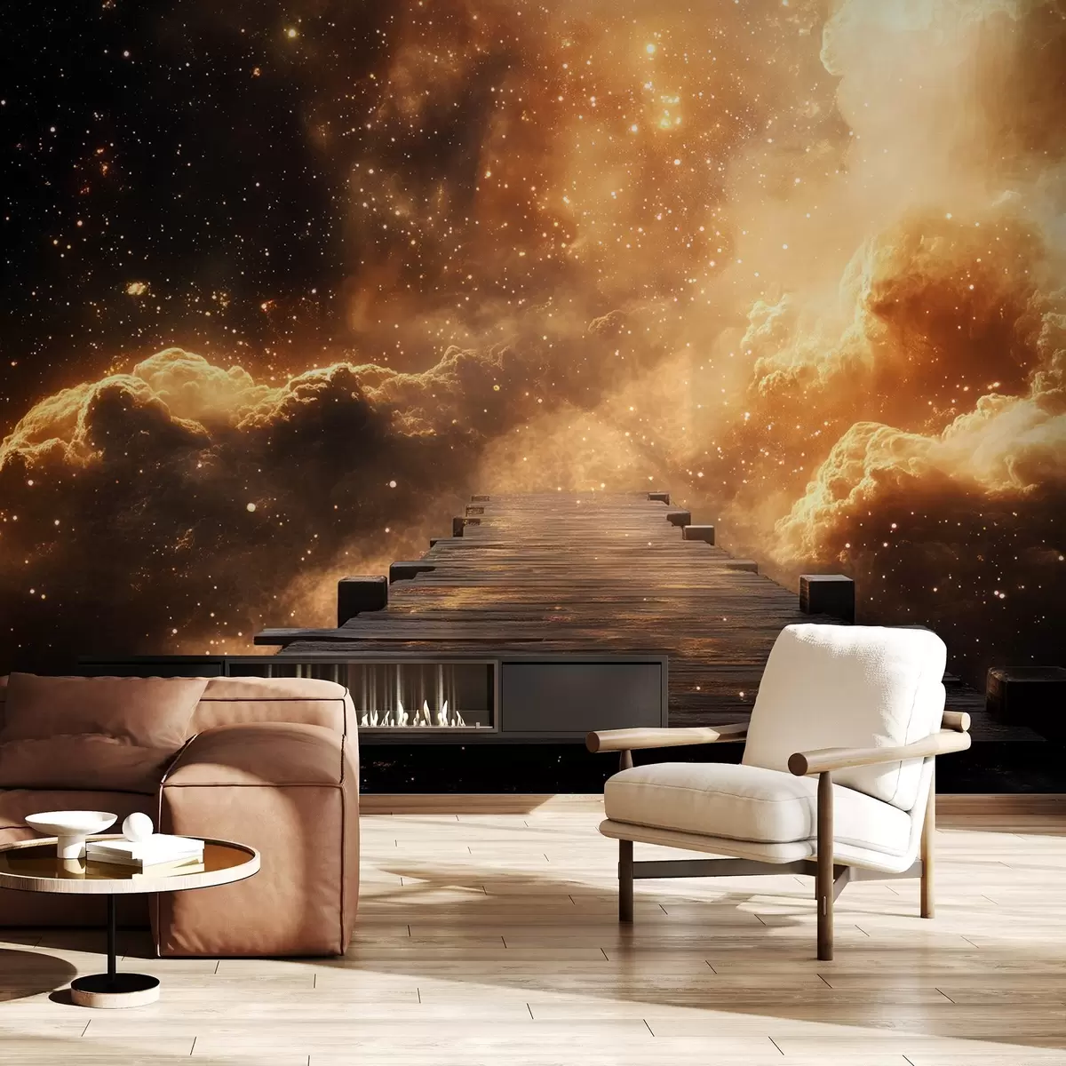 Fototapeter Kosmisk gul-svart stjernehimmel med en trebrygge Nr. w08723