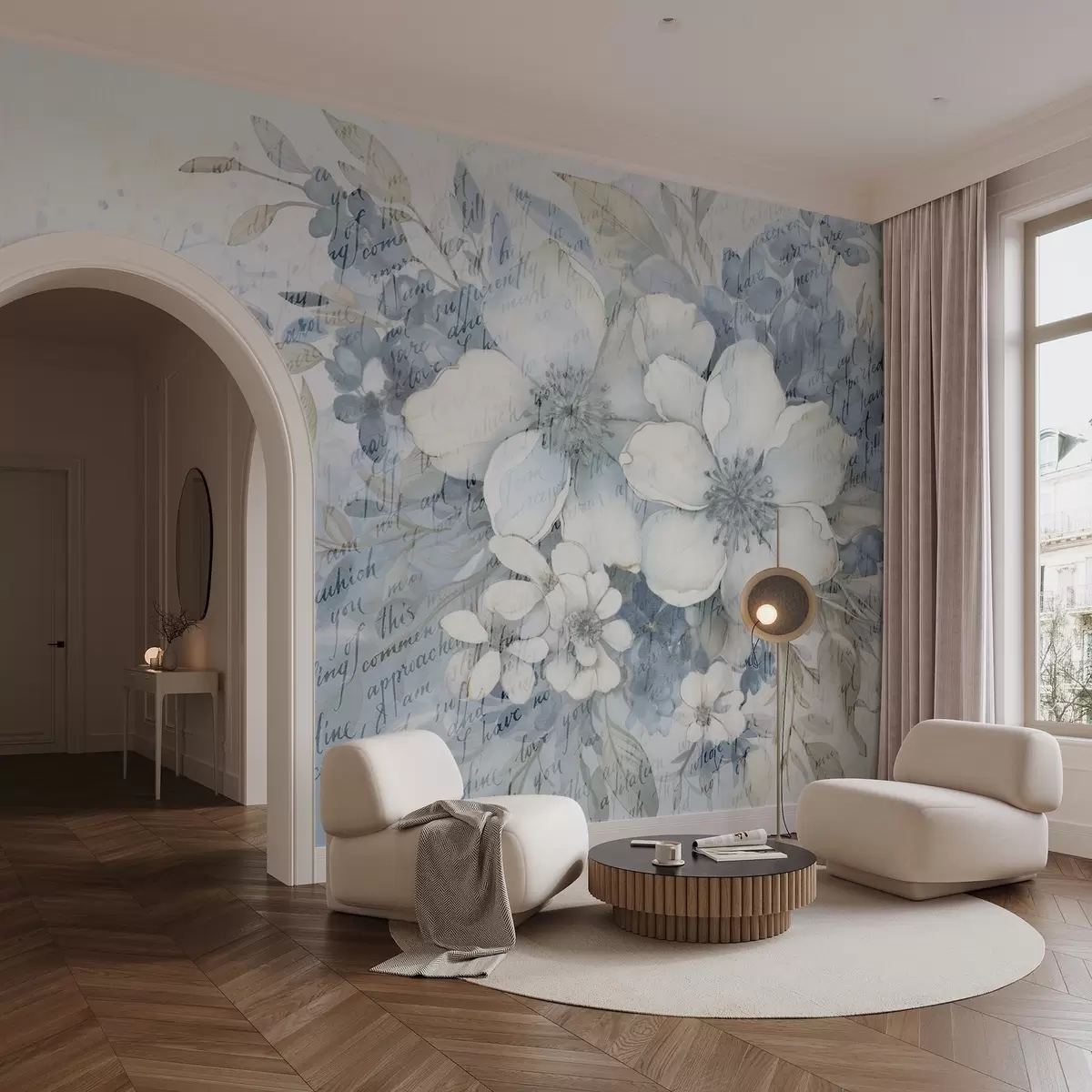 Fototapeter En myk veggimitasjon med teksturerte hvite og blå blomster, mot en blek bakgrunn med svak håndskrevet tekst Nr. w08771