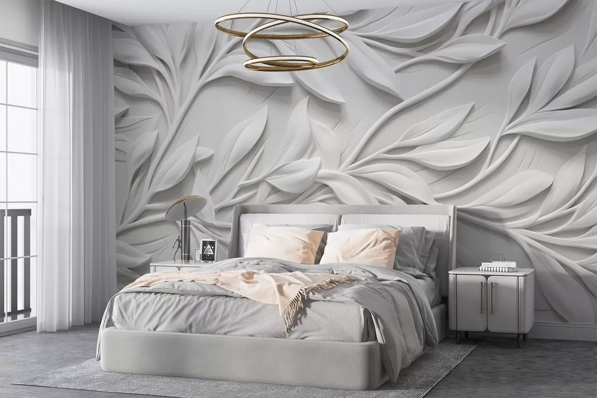 Fototapeter Hvitt, strukturert trykk med blader og grener som skaper en voluminøs imitasjonseffekt på en strukturert bakgrunn Nr. w08778