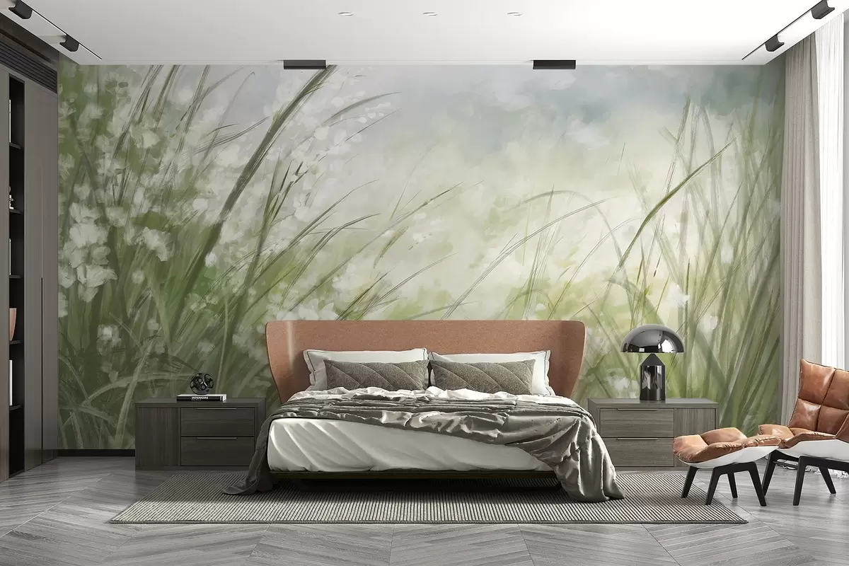 Fototapeter Frodig grønt gress med delikate hvite blomster, mykt uskarpt trykk med lyse fargetoner som skaper et rolig landskap Nr. w08779