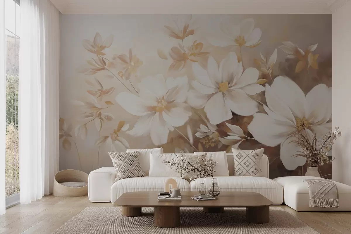 Fototapeter Hvitmalte blomster med myke kronblader og delikate blader, mot en lys beige og kremfarget bakgrunn Nr. w08780