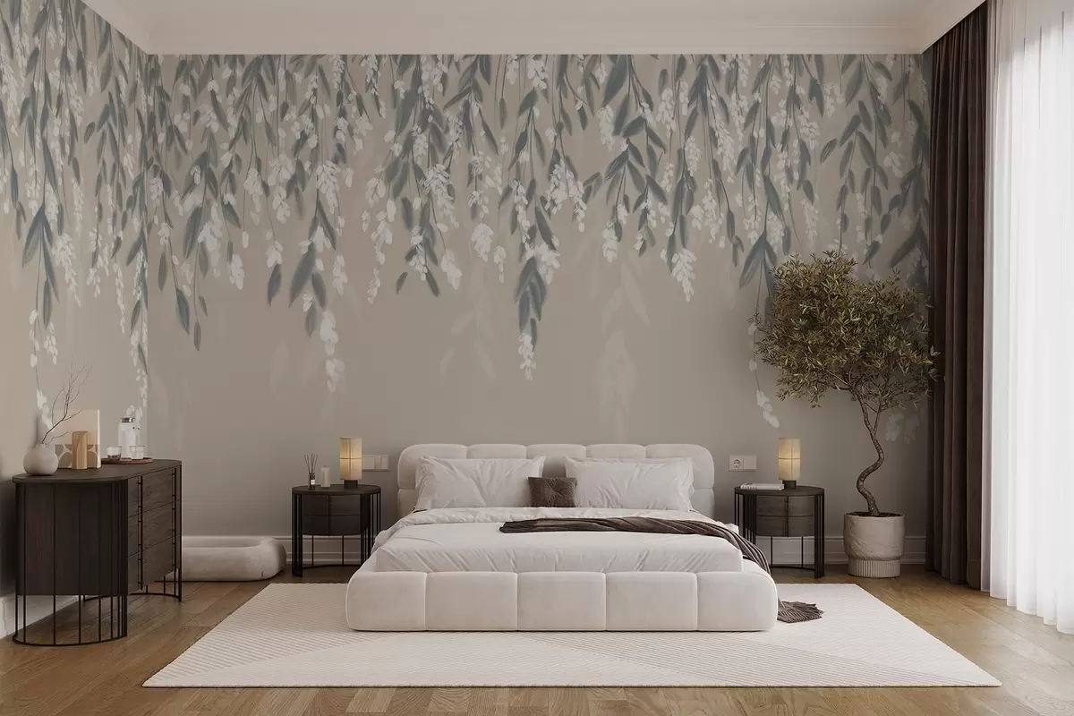 Fototapeter Kaskader av løvgrener i duse grønne nyanser med hvite blomster og blader på beige bakgrunn Nr. w08781