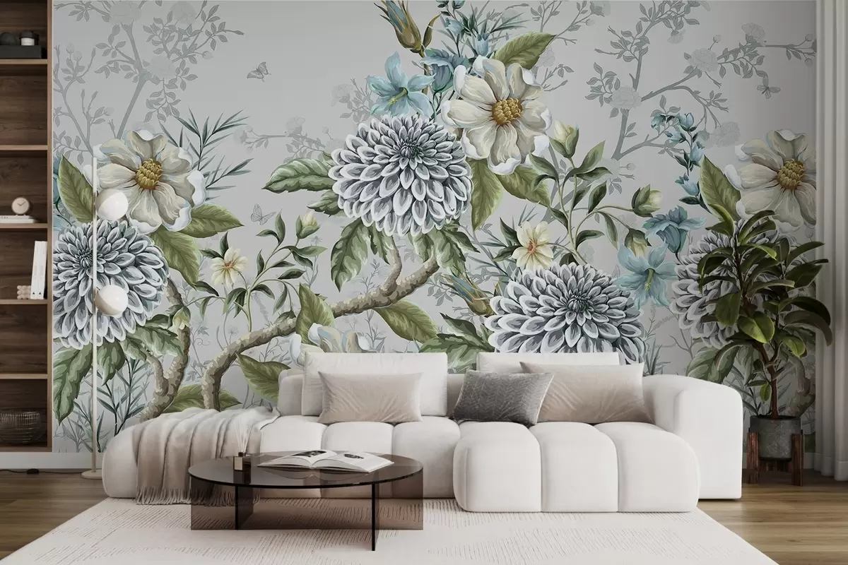 Fototapeter Et blomstertrykk med krysantemum, delikate blå blomster og grønne blader flettet sammen med grener Nr. w08782
