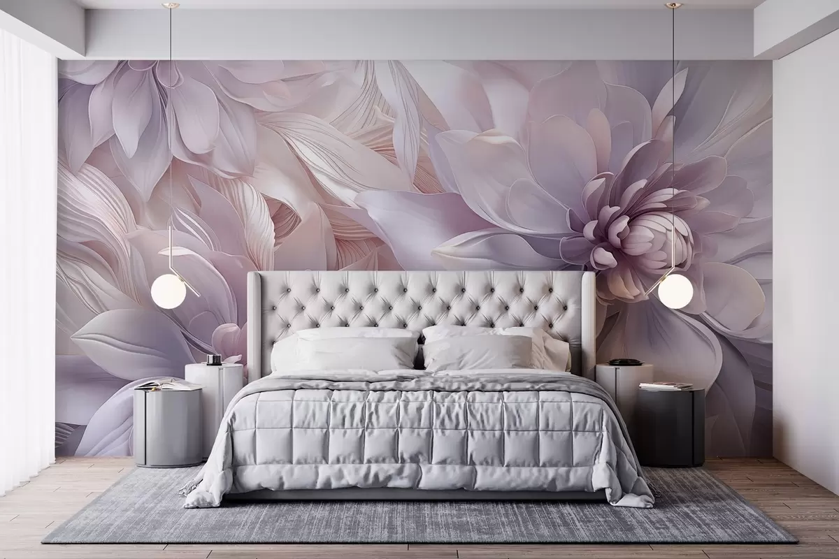 Fototapeter Myke, lagdelte blomster i blekrosa, lavendel og hvite nyanser med delikate kronblader og intrikate detaljer Nr. w08783