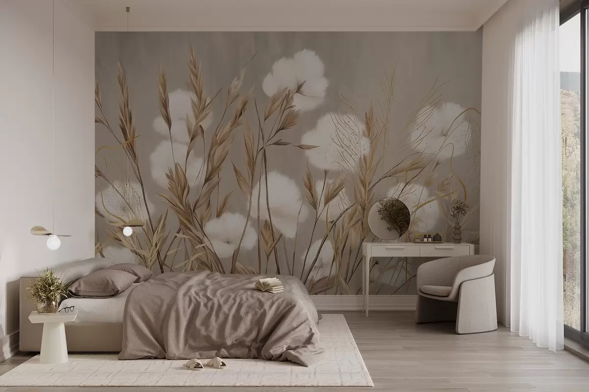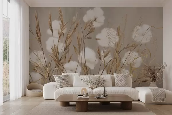 Fototapeter Myke, myke, hvite bomullsblomster og høye, oransje gresspigger mot en beige bakgrunn med dempet struktur Nr. w08784