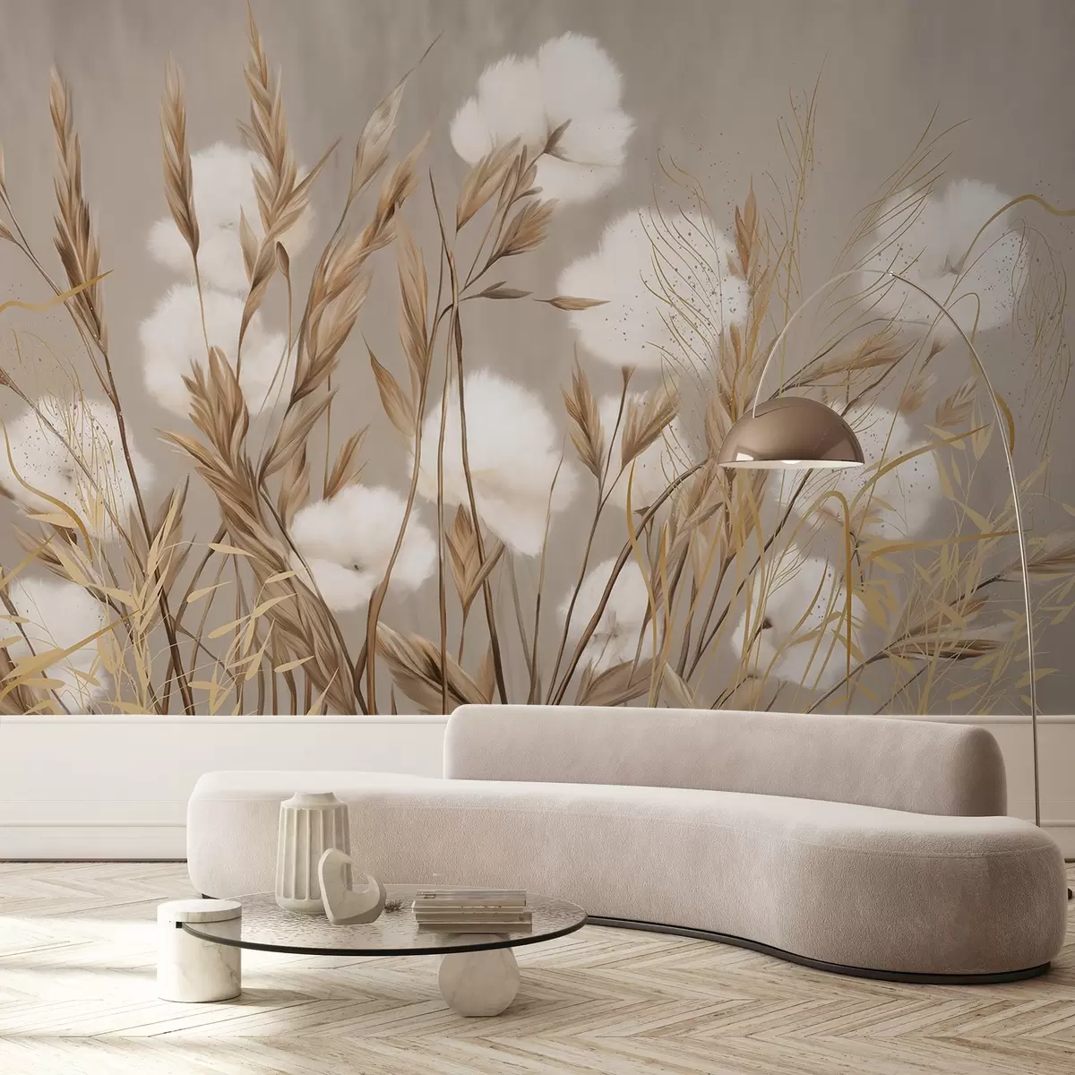 Fototapeter Myke, myke, hvite bomullsblomster og høye, oransje gresspigger mot en beige bakgrunn med dempet struktur Nr. w08784