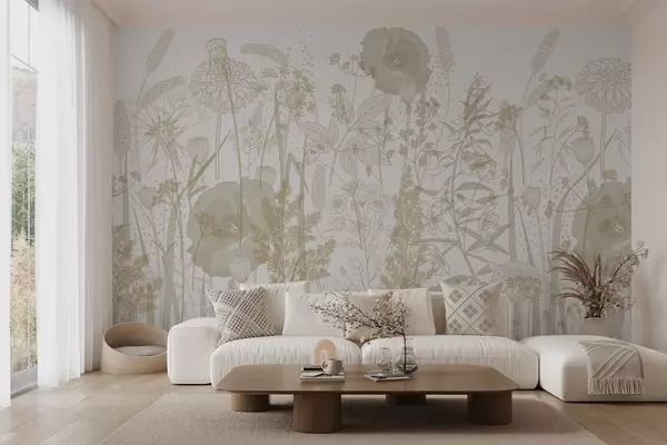 Fototapeter Et felt med høye blomster og gress i lyse beige pastellfarger på en hvit bakgrunn Nr. w08829v1