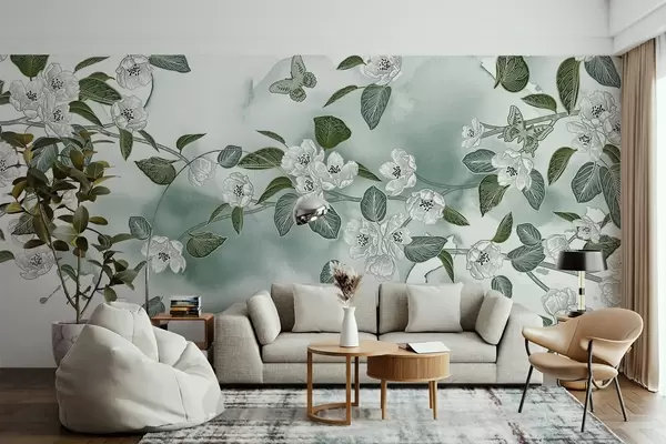 Fototapeter Kirsebærtre med blomster, blader og sommerfugler på en lysegrønn akvarellteksturert bakgrunn Nr. w08831