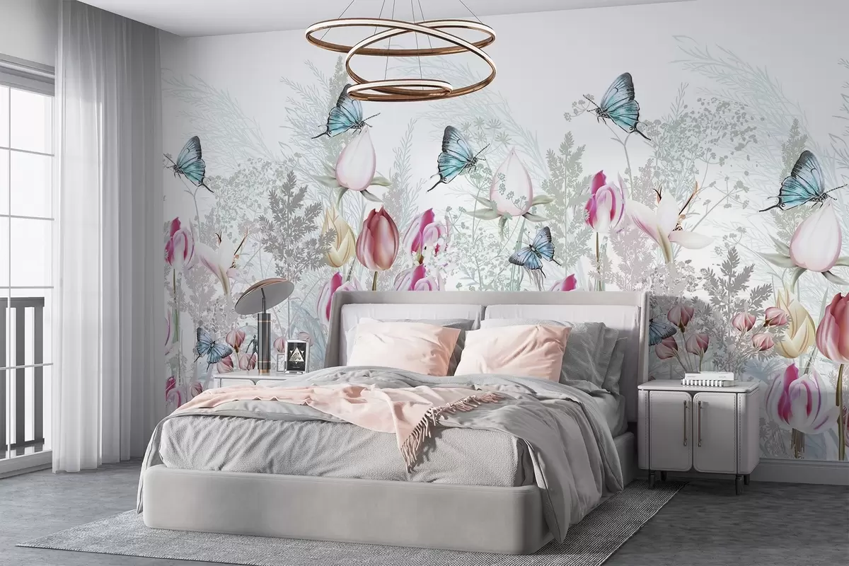 Fototapeter Pastelltrykk med tulipanblomster, gress og sommerfugler som flyr i en hage Nr. w08834