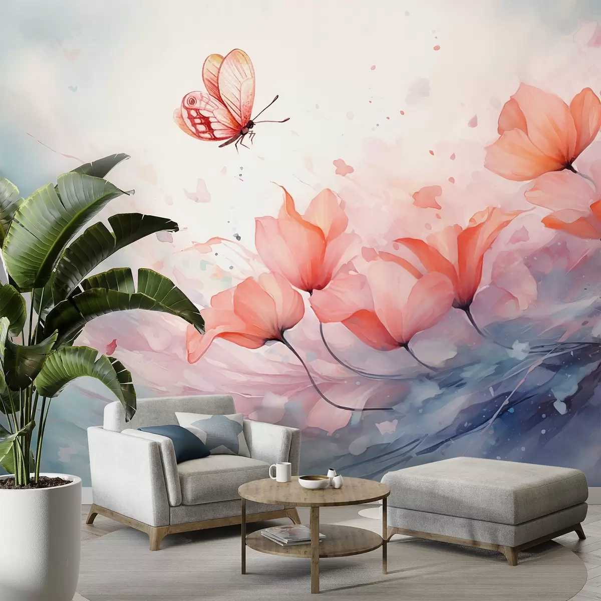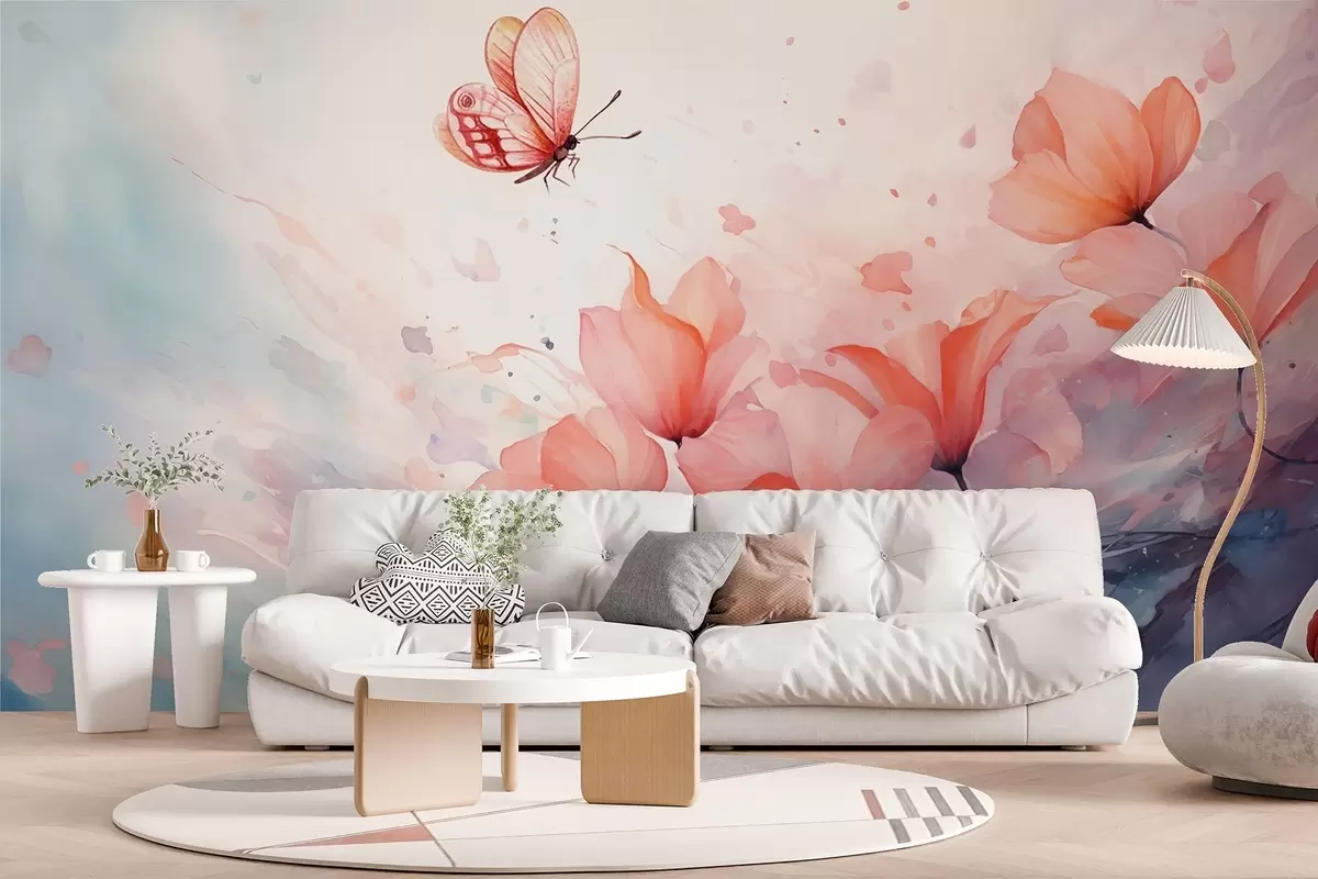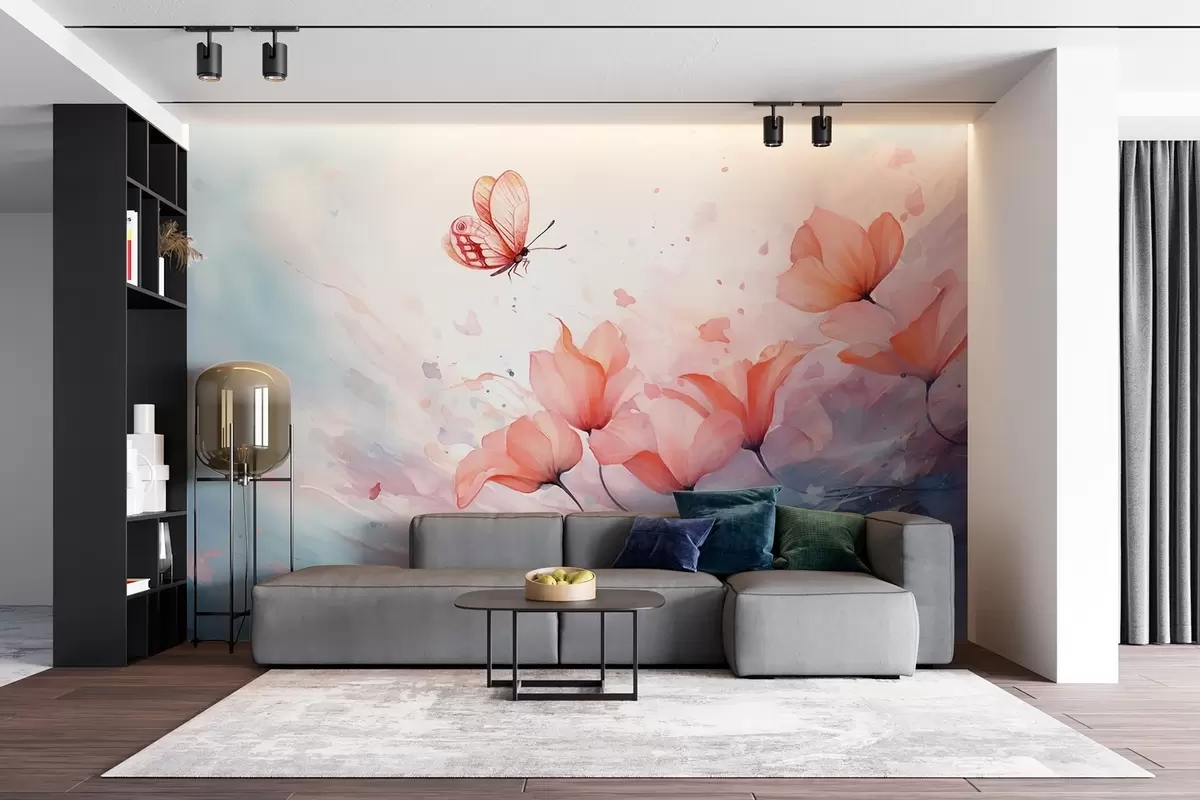 Fototapeter Delikate valmuer med en sommerfugl i akvarellstil Nr. w08849