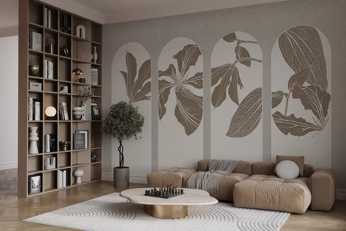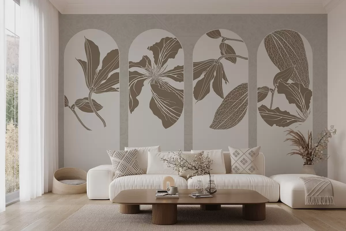 Fototapeter Elegante buer med blomstermønster i beige og hvitt, mot en strukturert beige bakgrunn, minimalistisk stil Nr. w08866