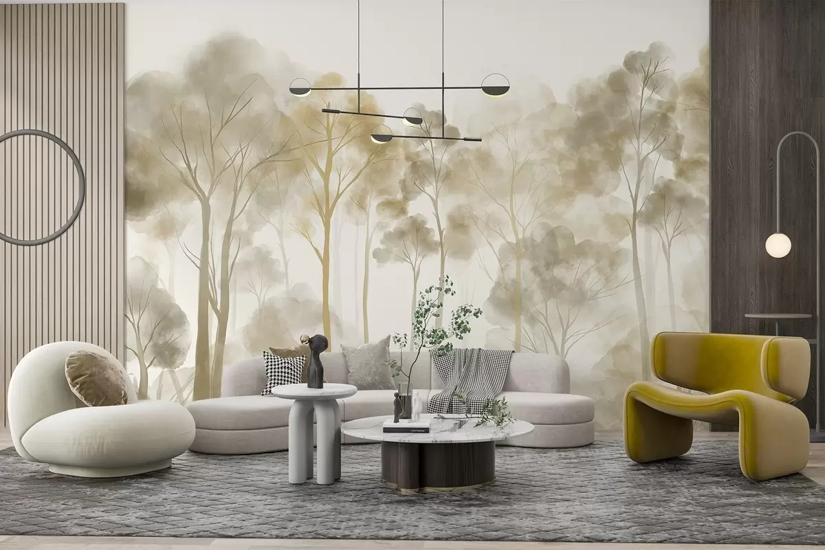 Fototapeter Skog i akvarellstil med høye lyse trær i beige og gule nyanser, med en tåkete atmosfære Nr. w08870