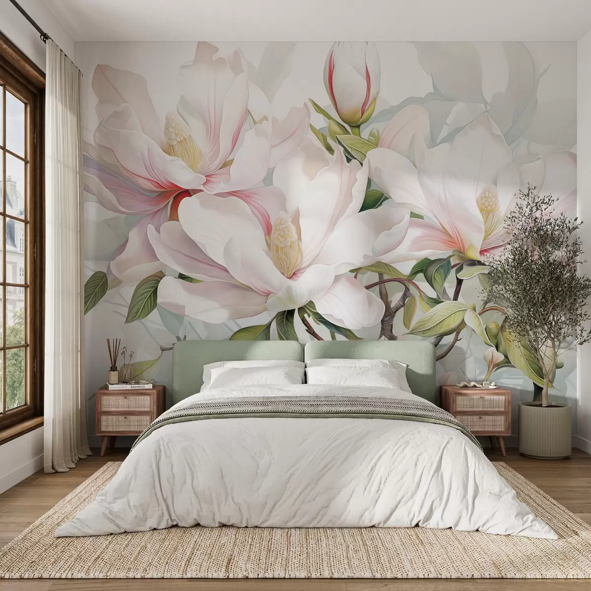 Fototapeter Magnoliablomster med hvite og rosa kronblader, blader og brune grener, myk og delikat akvarellstil Nr. w08885