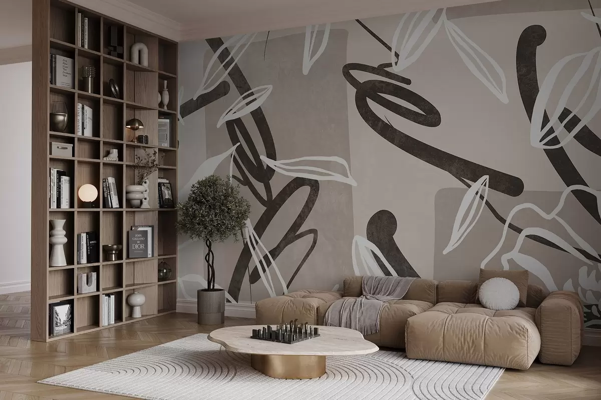 Fototapeter Abstrakt, strukturert, moderne og minimalistisk design med blomsterelementer i en nøytral beige fargepalett Nr. w08888