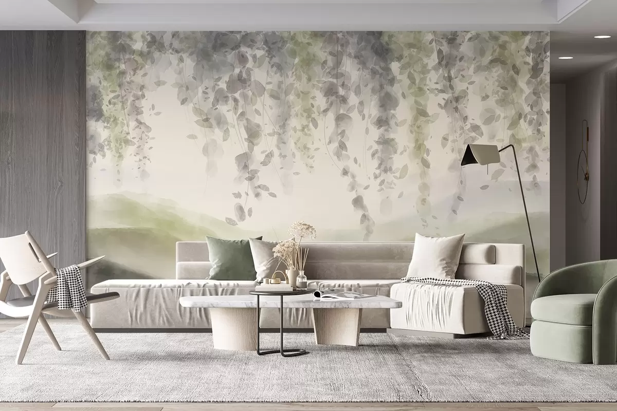 Fototapeter Blåregnblader som henger over blå fjell, myke pastellgrønne og beige farger, landskap i akvarellstil Nr. w08909v2
