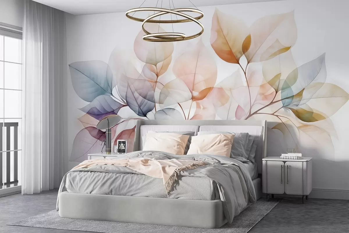Fototapeter Akvarellmaleri av gjennomskinnelige blader i pastellfarger, med nyanser av rosa, hvitt, lilla og blått Nr. w08910
