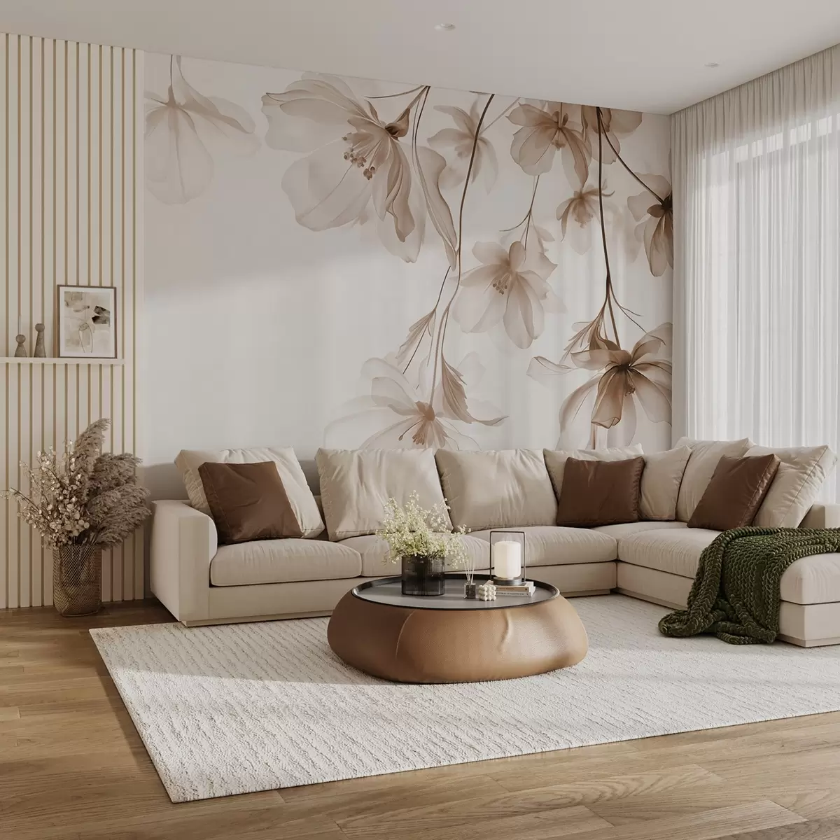 Fototapeter Beige blomster med gjennomskinnelige kronblader som henger fra en gren, beige og hvit, minimalistisk moderne kunstkomposisjon Nr. w08911v1