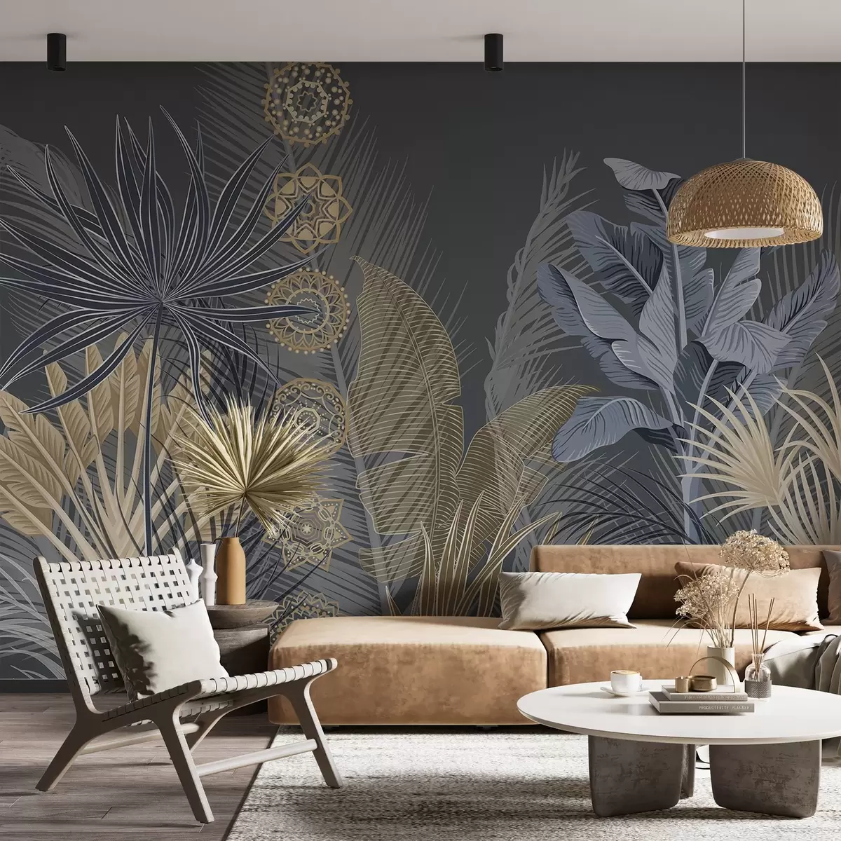 Fototapeter Tropiske blader i blå og brune toner, palmeblader, bananblader og mandala-ornamenter, mørk bakgrunn Nr. w08913