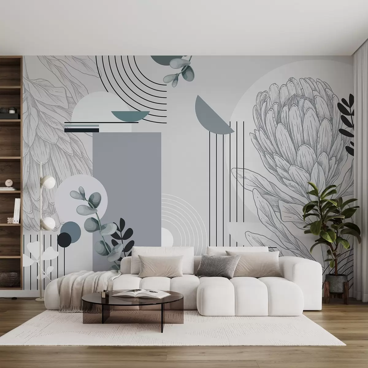 Fototapeter Abstrakt botanisk trykk med proteablomst, eukalyptusblader, geometriske former i minimalistisk stil, pastellfarger Nr. w08914v1