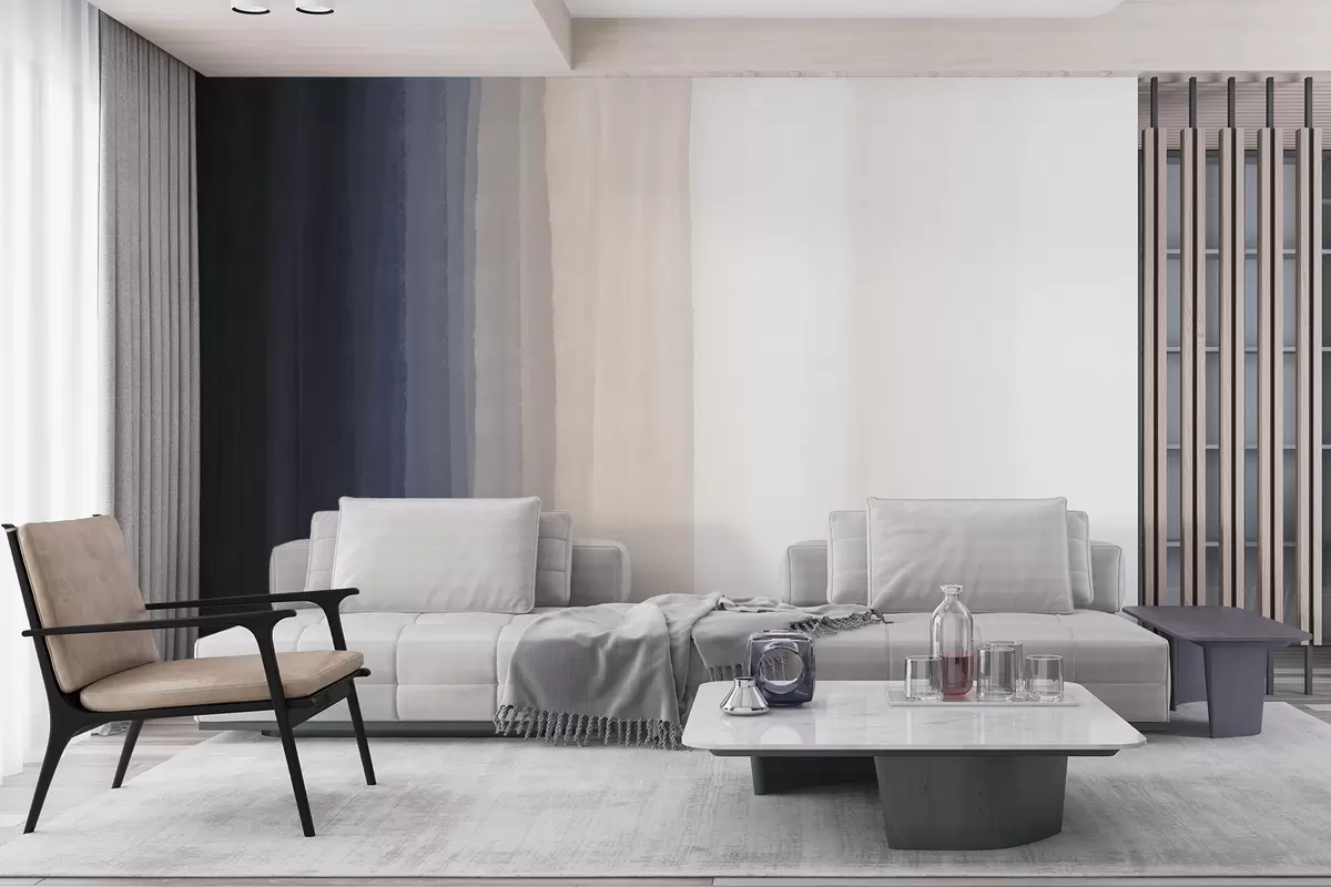 Fototapeter Abstrakt, minimalistisk gradienttrykk med vertikale striper i mørkeblått, lys fersken og hvitt Nr. w08915v1