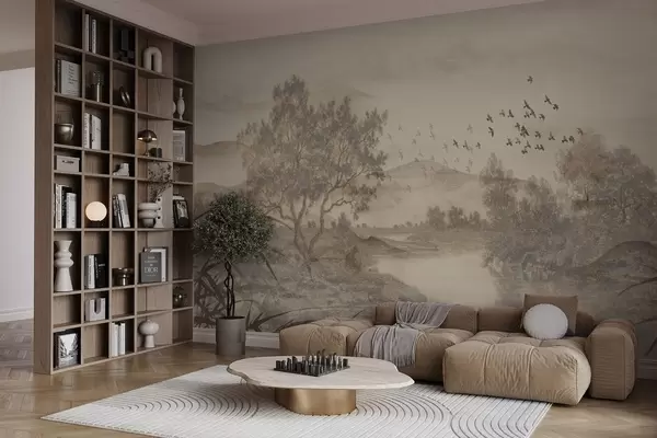 Fototapeter Teksturert vintagelandskap med et tre nær en elv og en overskyet himmel, naturkunst i sepiatoner Nr. w08920