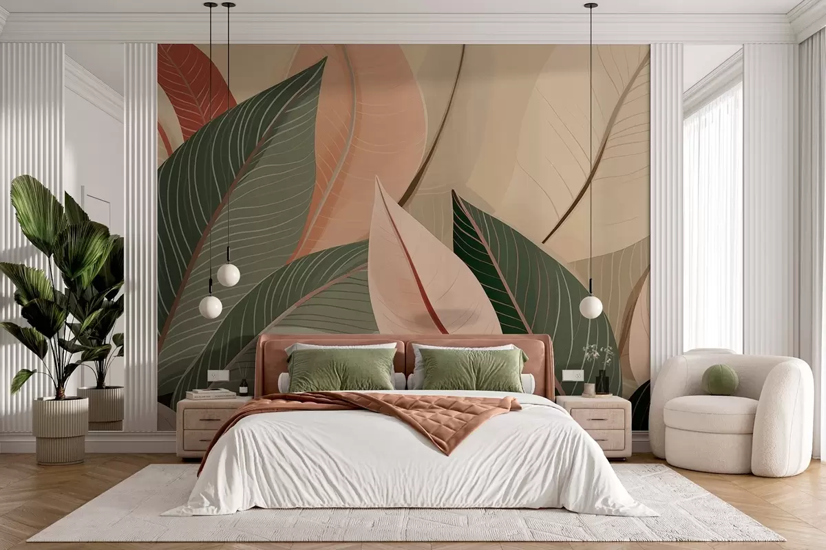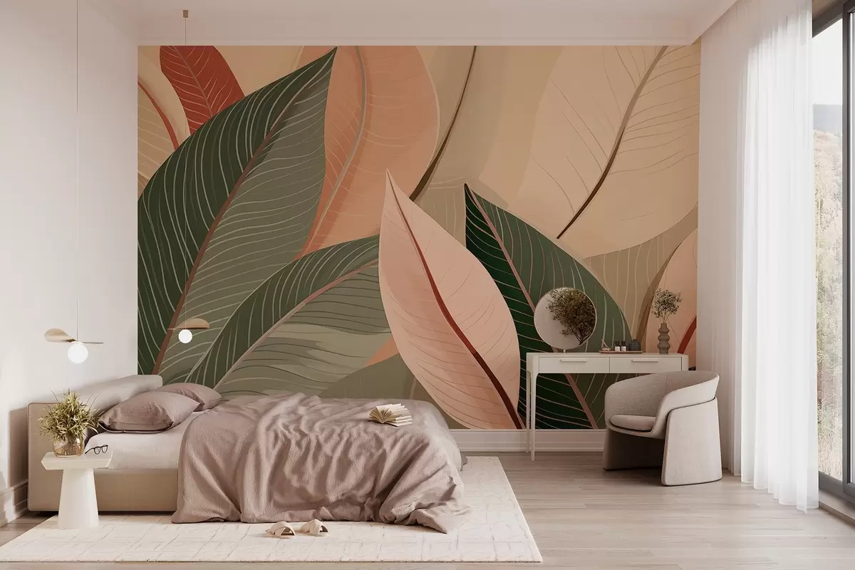 Fototapeter Nærbilde av blader i olivengrønne og rosa-kremfarger Nr. w08944