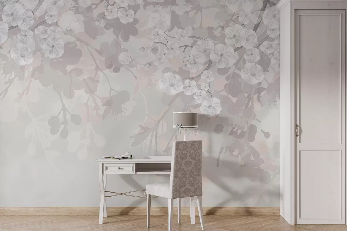 Fototapeter Kirsebærgrener med hvite blomster og grå blader, på elegante blomstersilhuetter i duse pastellfarger Nr. w08973v1