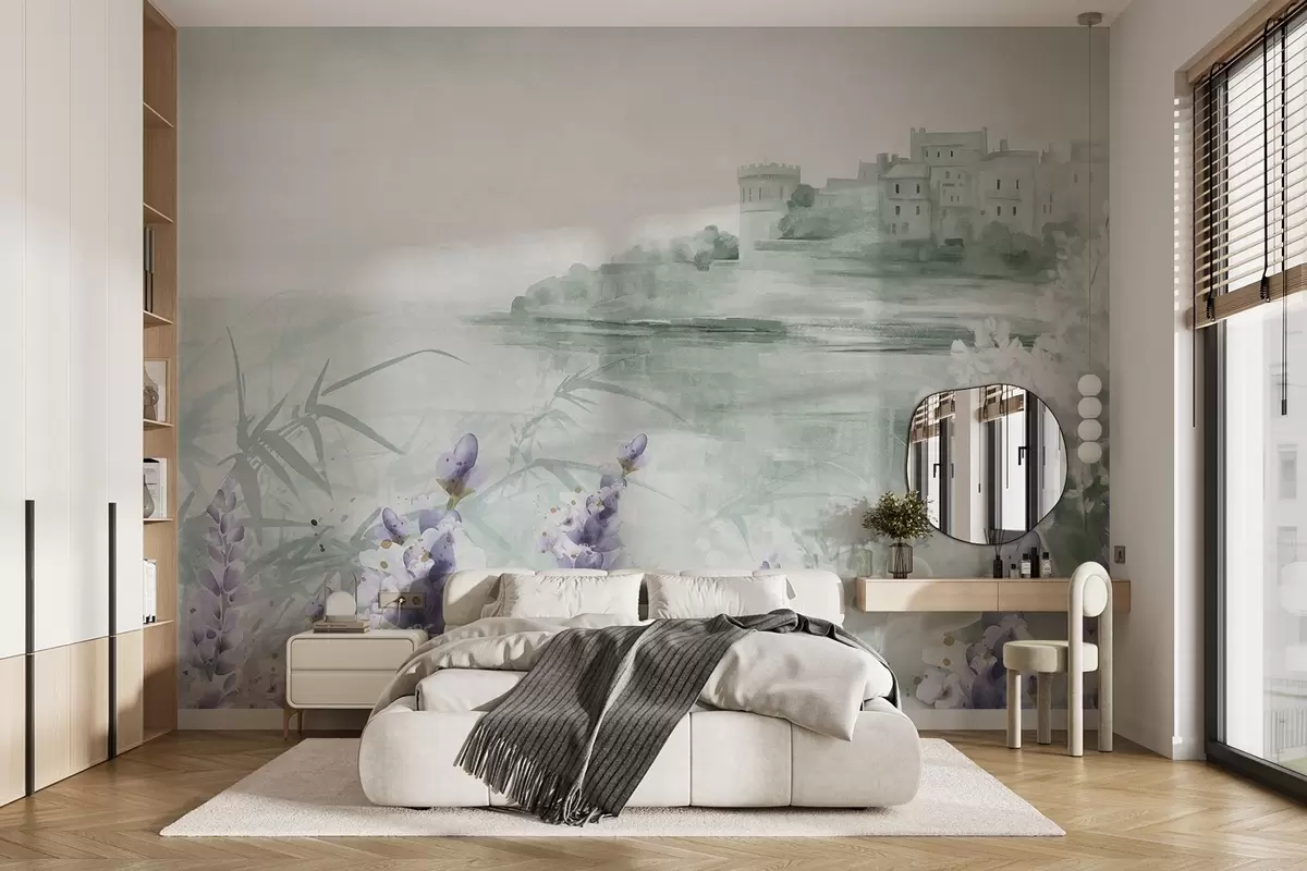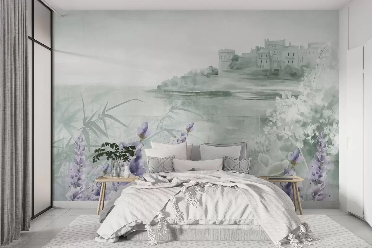 Fototapeter Teksturert vintagelandskap med et slott på en klippe med utsikt over havet, med lavendelblomster i dempede farger Nr. w08975