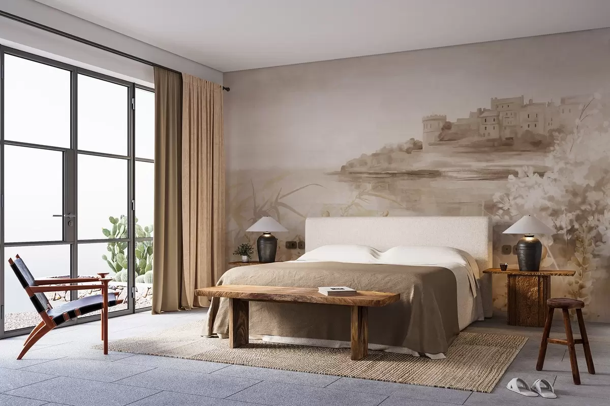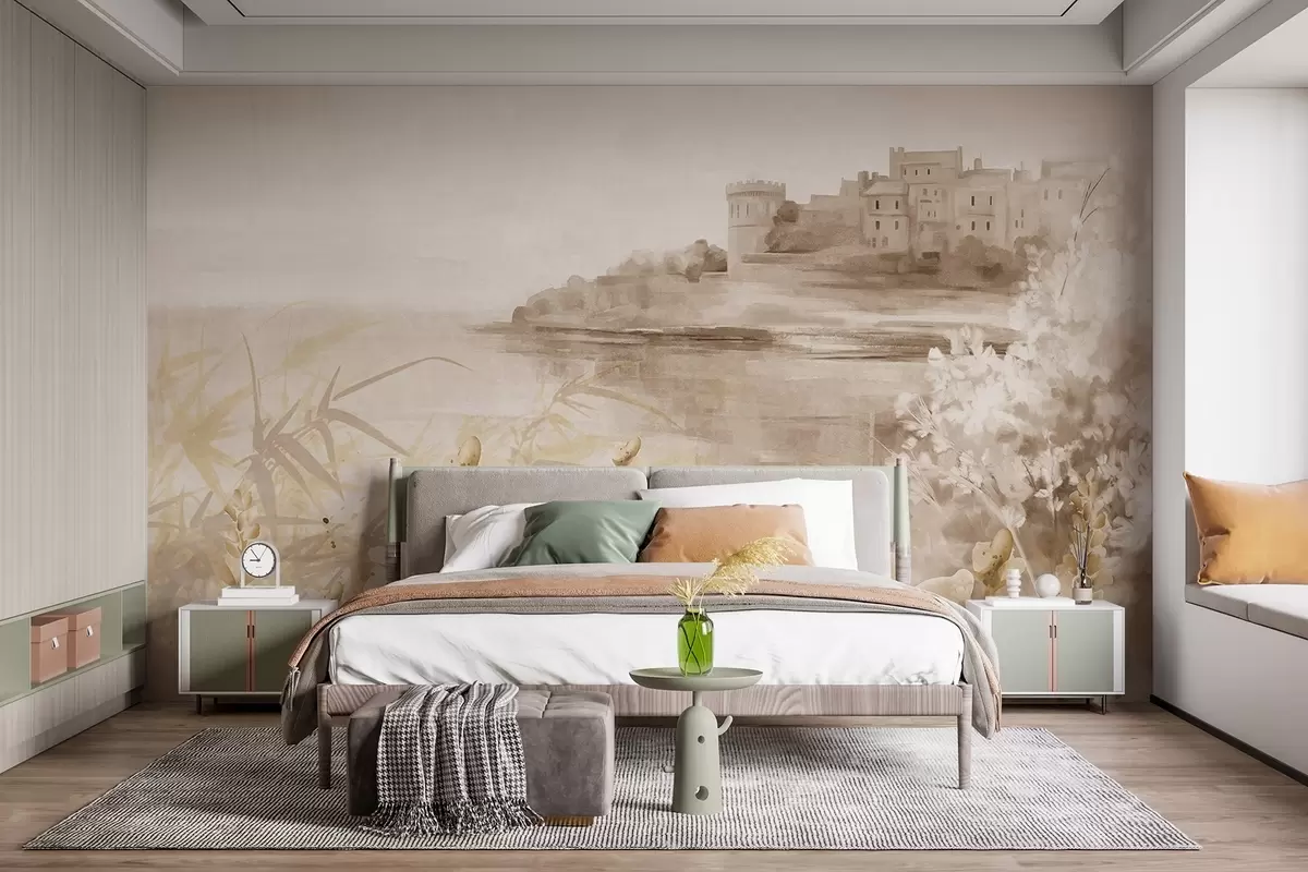Fototapeter Teksturert vintagelandskap med et slott på en klippe med utsikt over havet, med lavendelblomster i dempede farger Nr. w08975v1