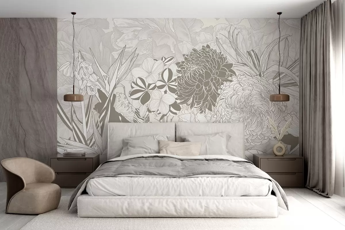 Fototapeter Blomster og blader i beige toner, inkludert krysantemum, plumeria og tropisk bladverk, botanisk design Nr. w08976