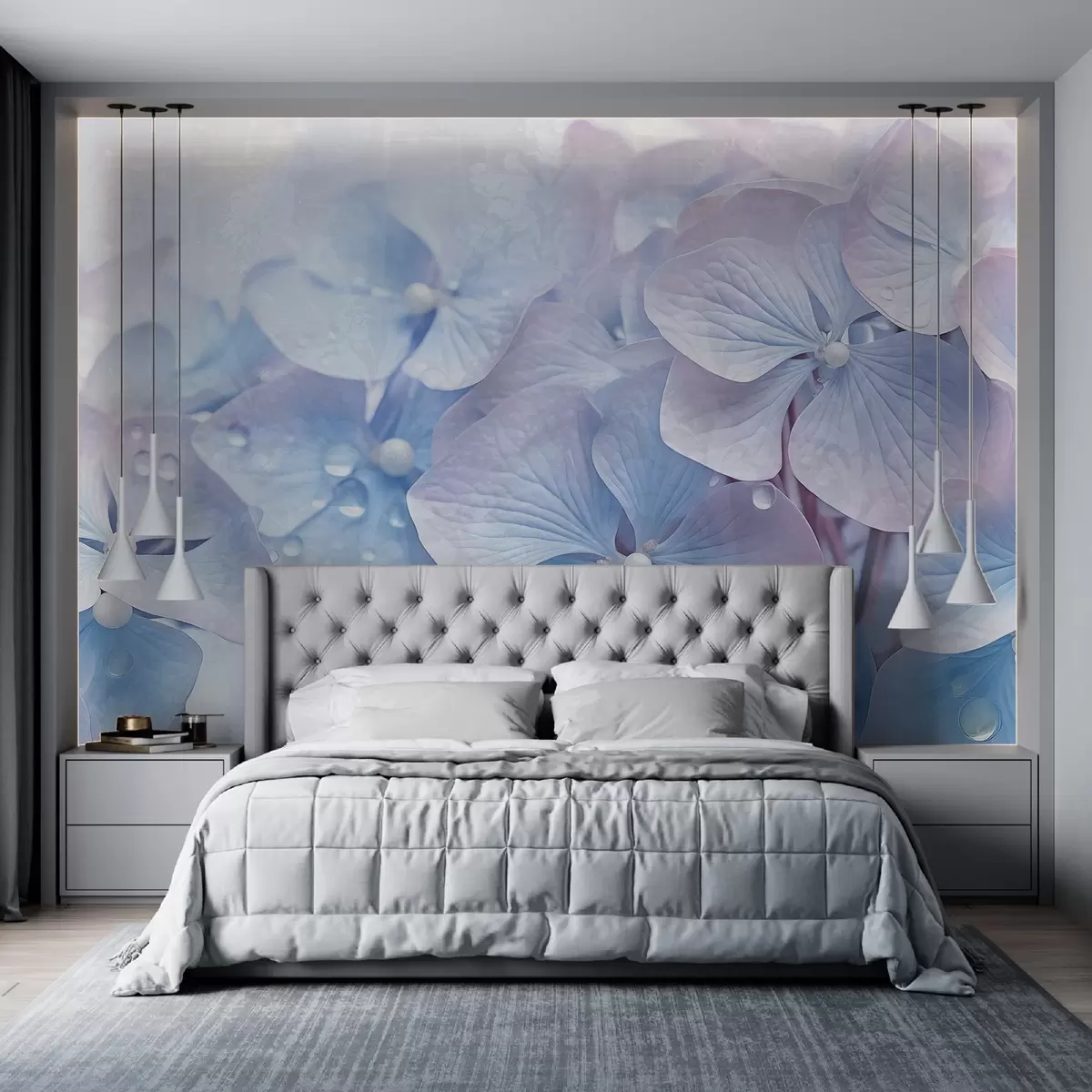 Fototapeter Vintage blå og rosa hortensiablomster med tekstur og vanndråper på kronbladene, uskarp rosa bakgrunn Nr. w08981