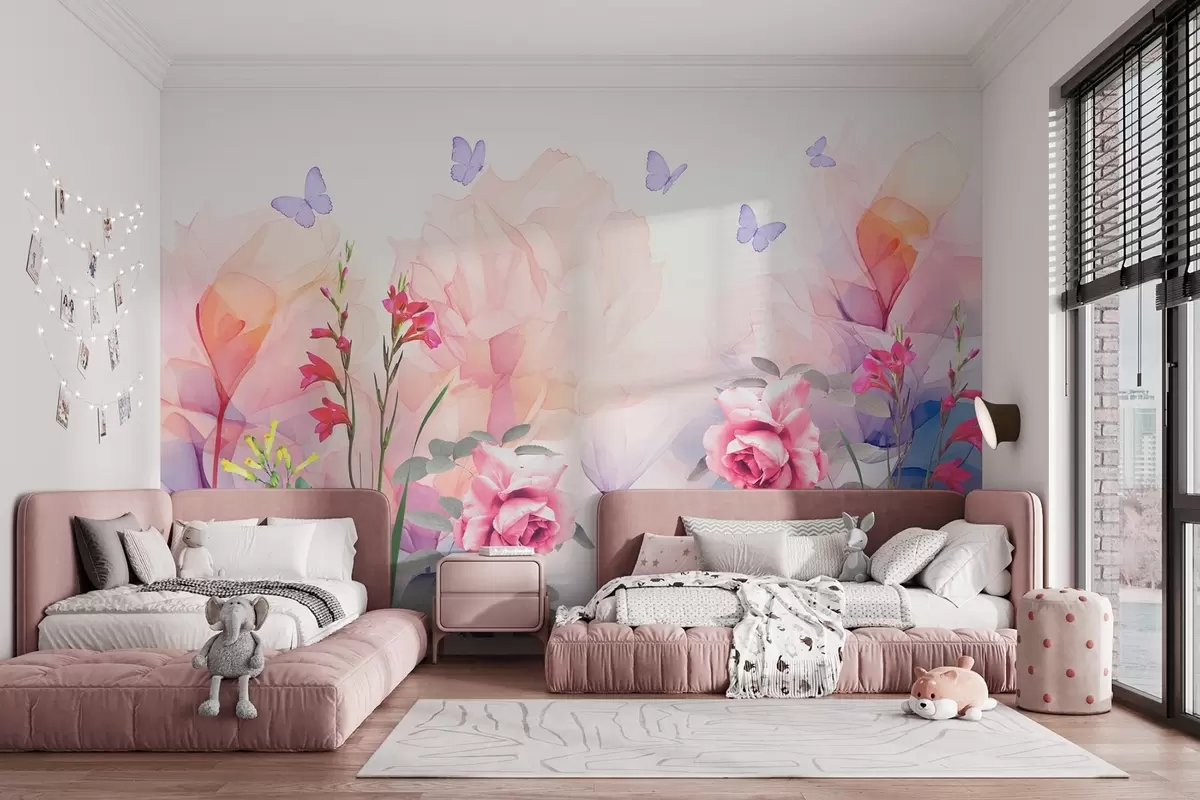 Fototapeter Blomster med sommerfugler og roser i akvarellstil Nr. w09002