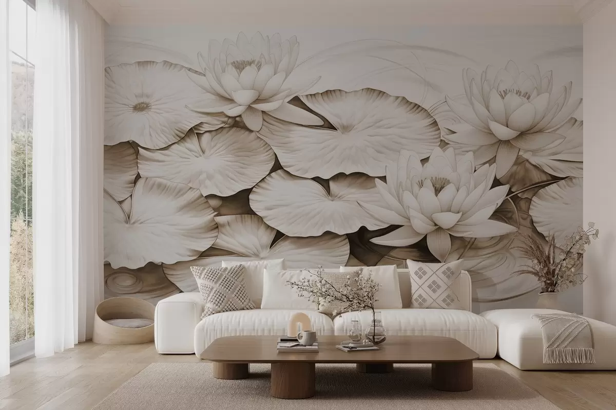 Fototapeter Vannliljer og nøkkeroser i en dam, brun og hvit imitasjon av blyanttegning, detaljert botanisk illustrasjon, naturkunst Nr. w09006v2
