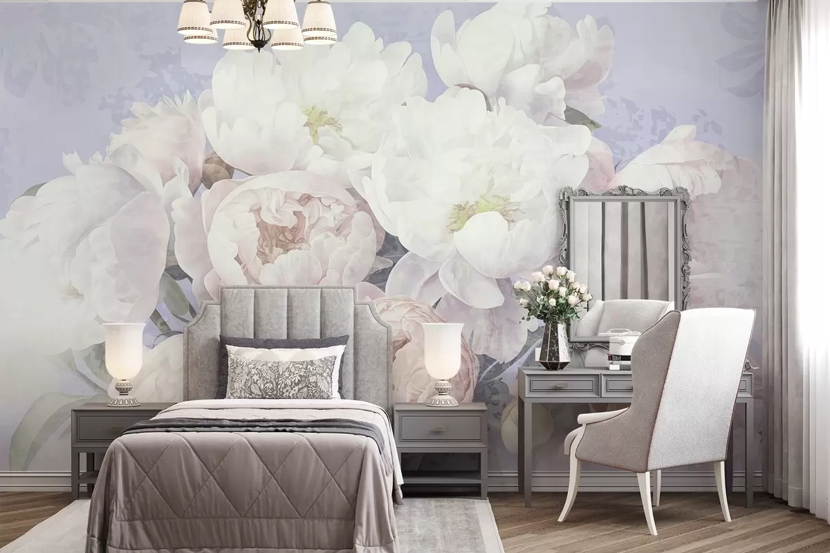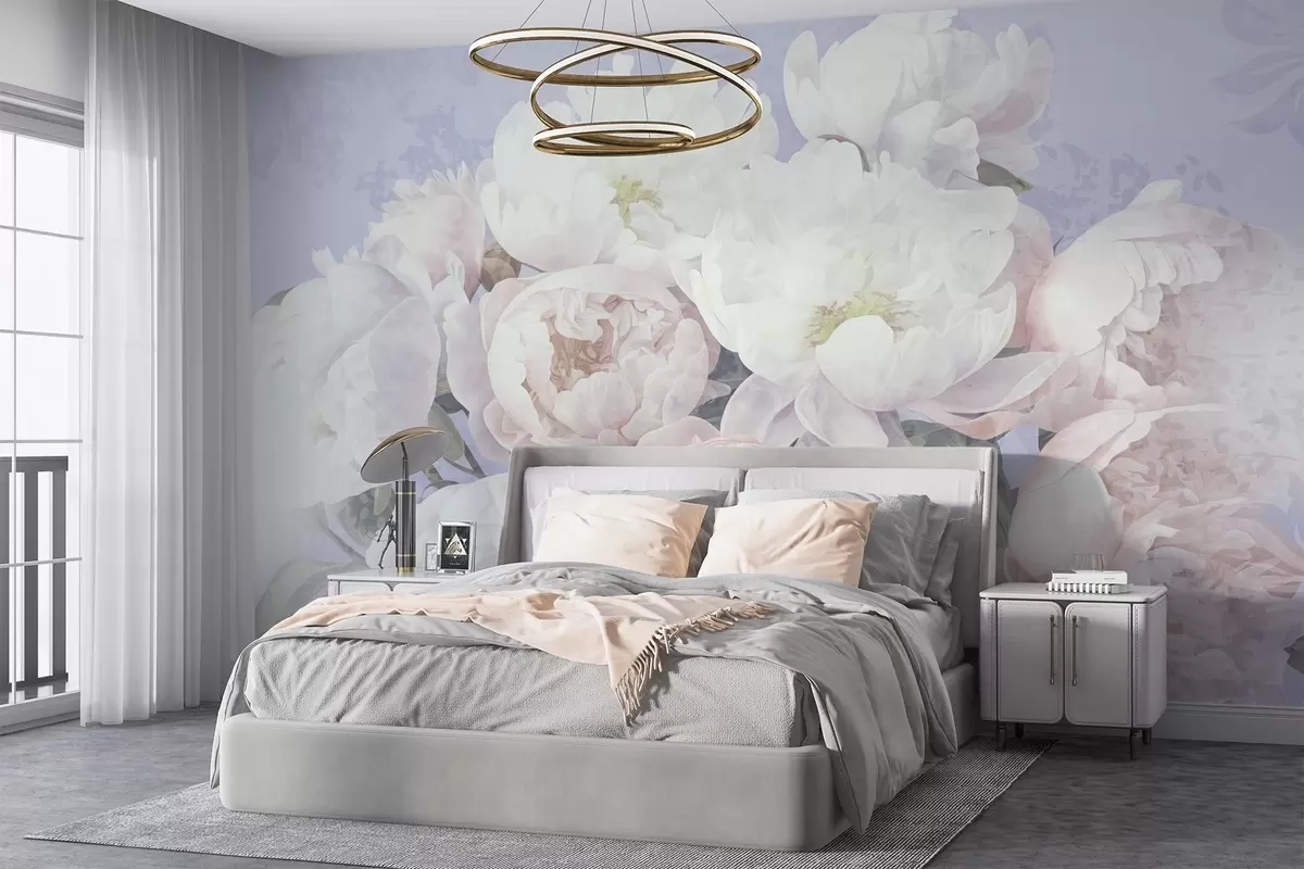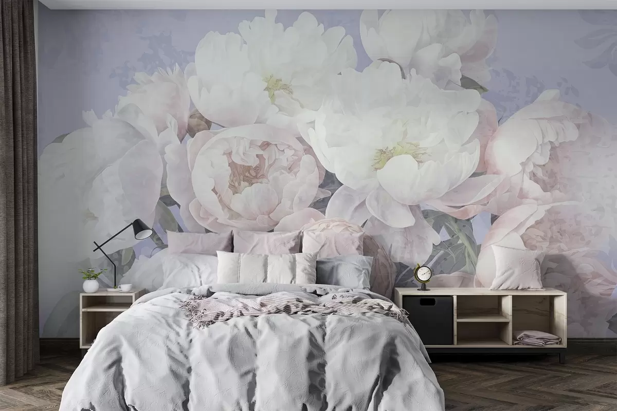 Fototapeter Abstrakte, teksturerte ferskenfargede og hvite pioner med grønne blader, lys bakgrunn, myke og delikate farger, vintage-stil Nr. w09008v1