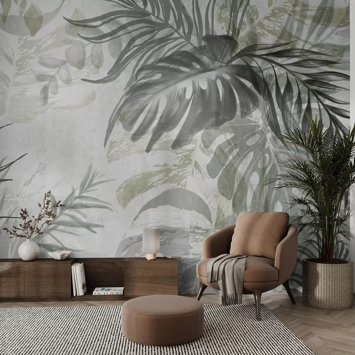 Fototapeter Monstera og palmeblader i nyanser av grønt og grått, botanisk, tropisk bladverk, jungelplanter, strukturert bakgrunn Nr. w09011
