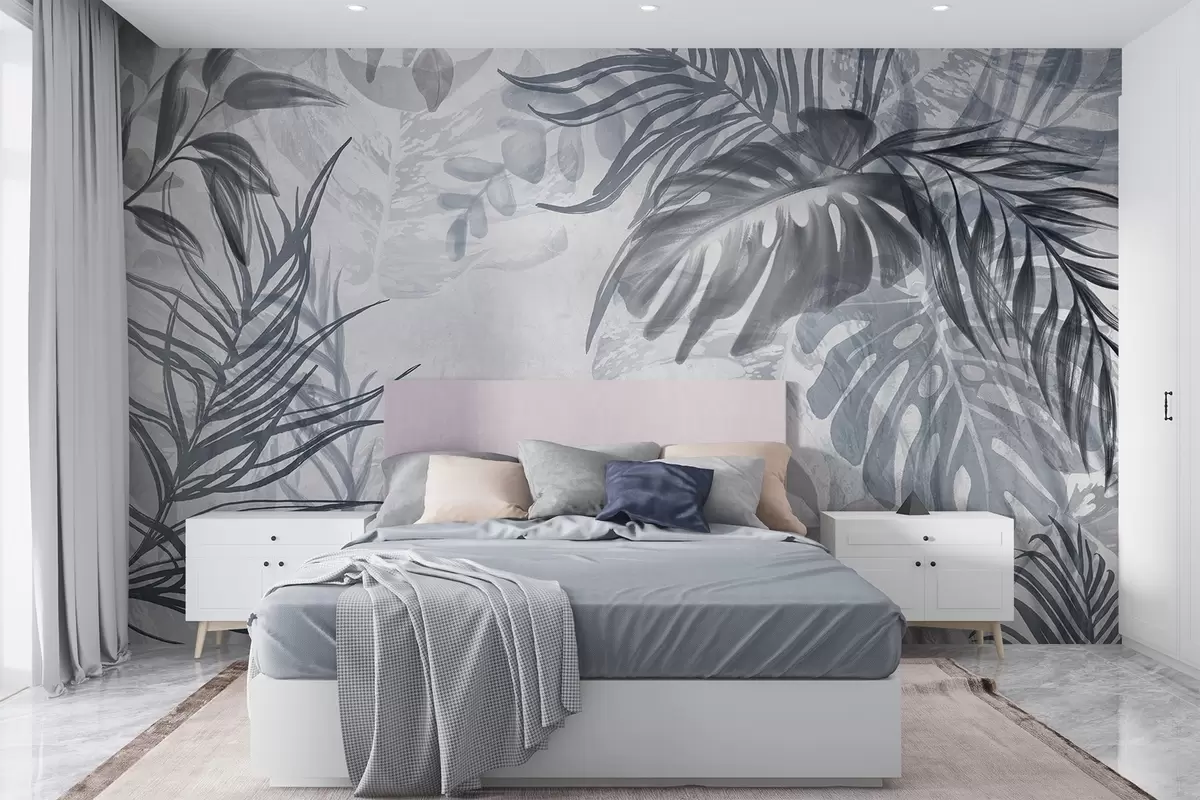 Fototapeter Monstera og palmeblader i nyanser av blått og grått, botanisk, tropisk bladverk, jungelplanter, strukturert bakgrunn Nr. w09011v1