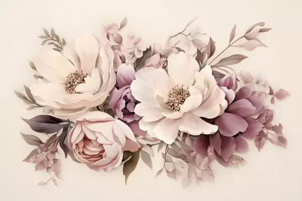 Fototapeter Delikat komposisjon av rosa og beige blomster, pioner med blader Nr. w09019