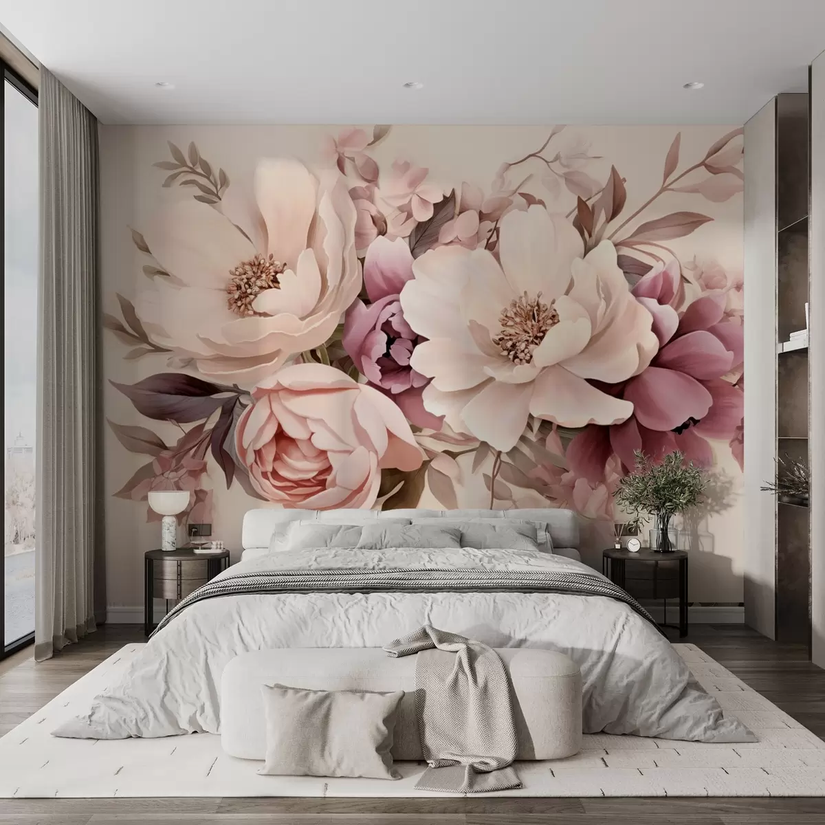 Fototapeter Delikat komposisjon av rosa og beige blomster, pioner med blader Nr. w09019