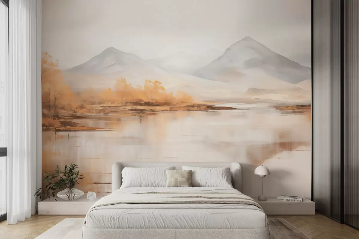 Fototapeter Høstlandskap med gule trær og en elv mot en fjellkulisse Nr. w09020